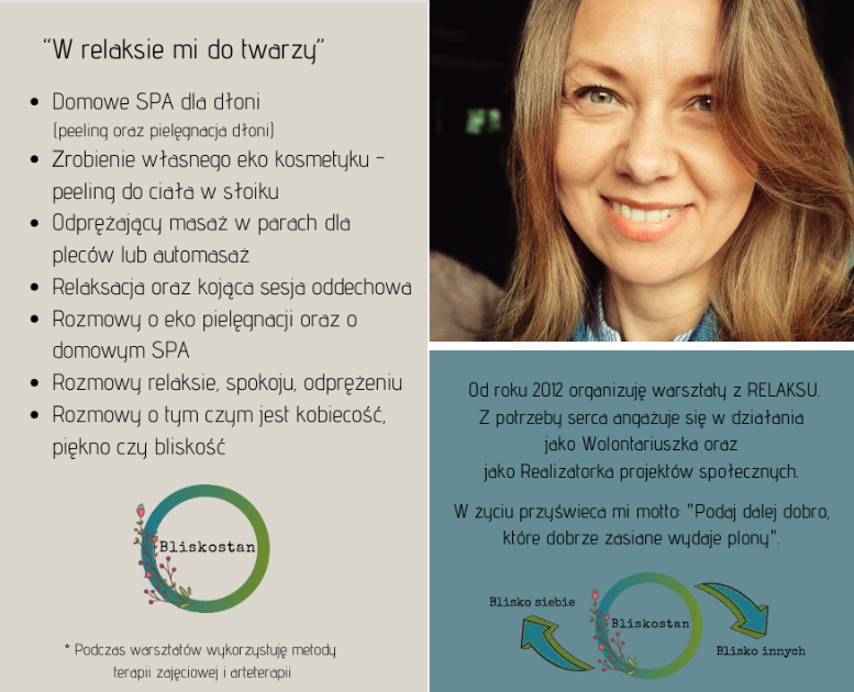 To popołudnie stworzone zostało z myślą o zatrzymaniu się na chwilę, zadbaniu o siebie oraz budowaniu wartościowych relacji w atmosferze lekkości i dobrostanu. Spotkanie poprowadzi Agnieszka Sudnikowicz - twórczyni Bliskostanu.