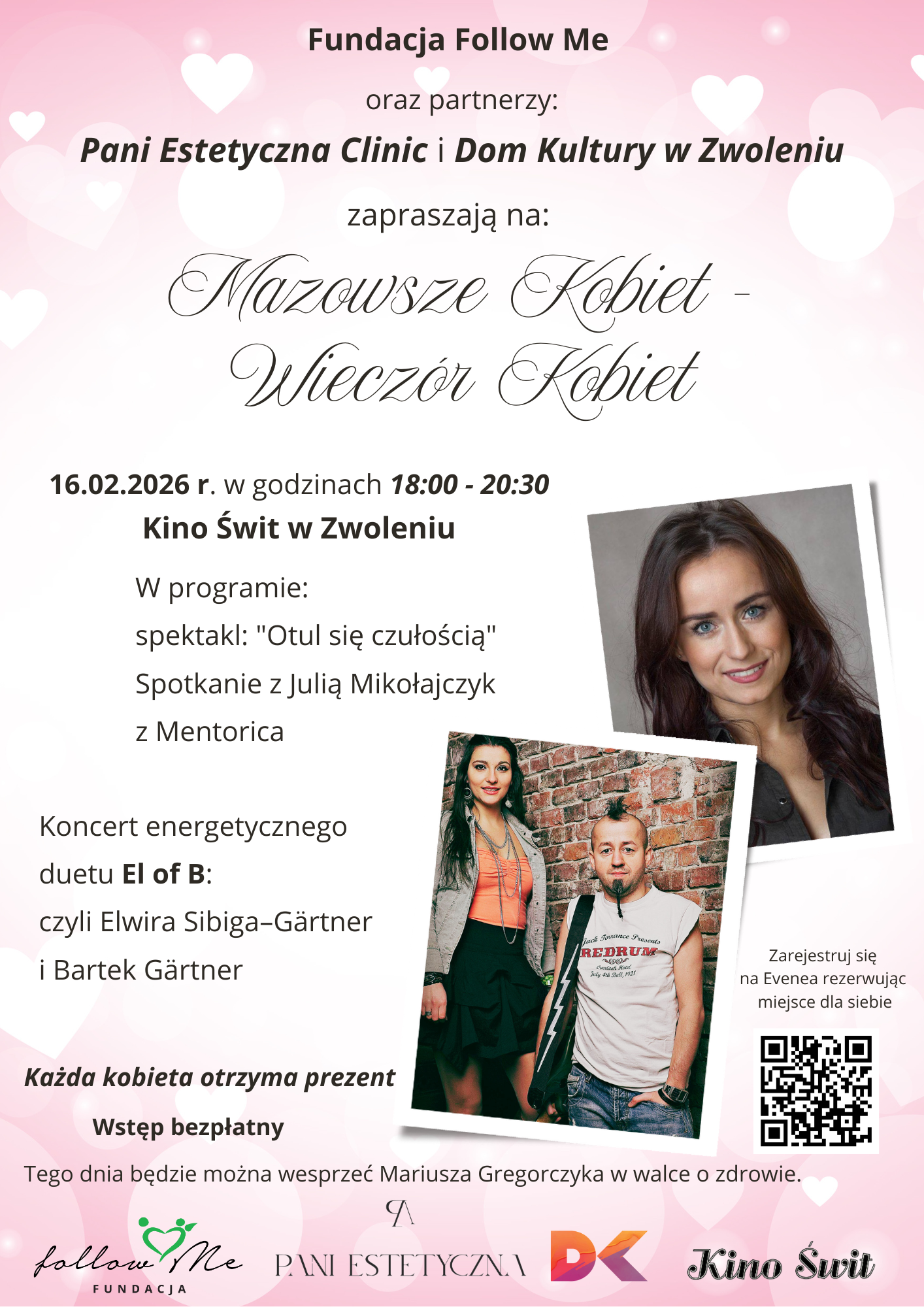 Już16 lutego 2026 Fundacja Follow Me zaprasza wszystkie Panie do Kina Świt na wyjątkowe spotkanie pod nazwą: MAZOWSZE KOBIET - "Otul się czułością" - pełen emocji, muzyki i dobrej energii.