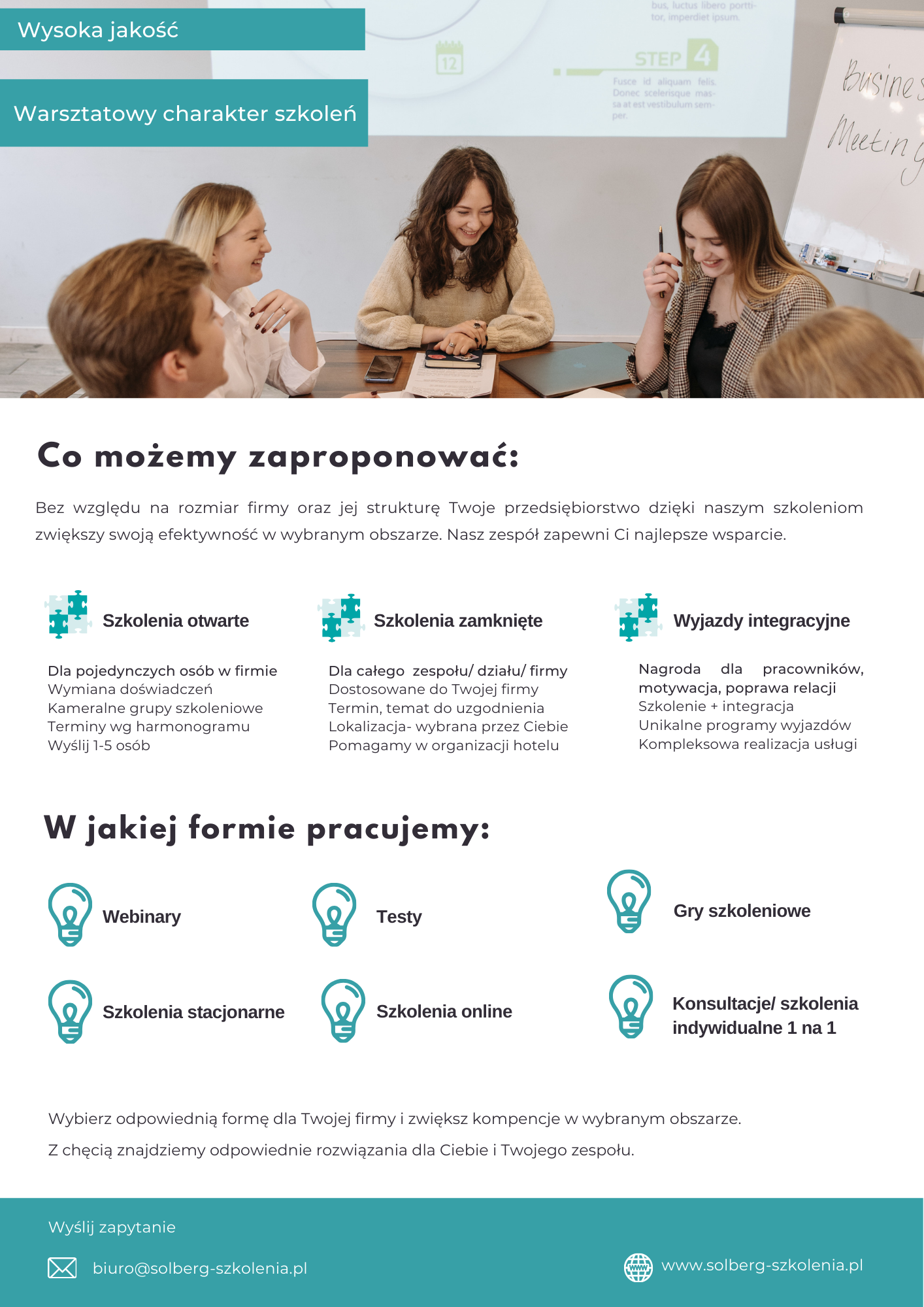 Grupa Szkoleniowa SOLBERG to zespół wyselekcjonowanych trenerów, coachów, doradców i wysokiej klasy ekspertów posiadających doskonałe przygotowanie merytoryczne, wybitne zdolności dydaktyczne oraz bogate doświadczenie w prowadzeniu szkoleń biznesowych.
