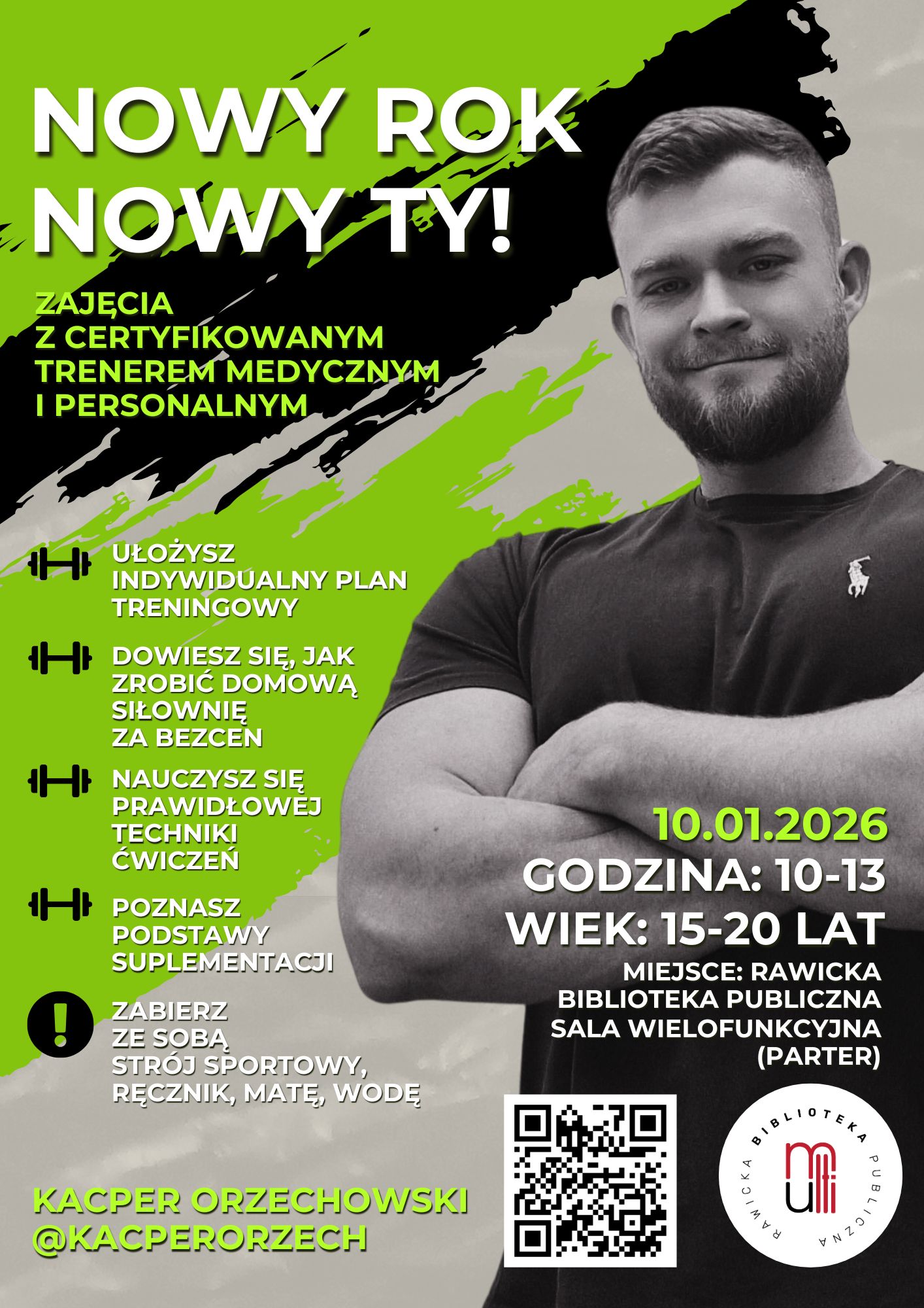 Zapraszamy młodzież w wieku 15-20 lat na bezpłatne zajęcia treningowe "Nowy Rok, Nowy Ty!", które poprowadzi Kacper Orzechowski - certyfikowany trener medyczny i personalny.