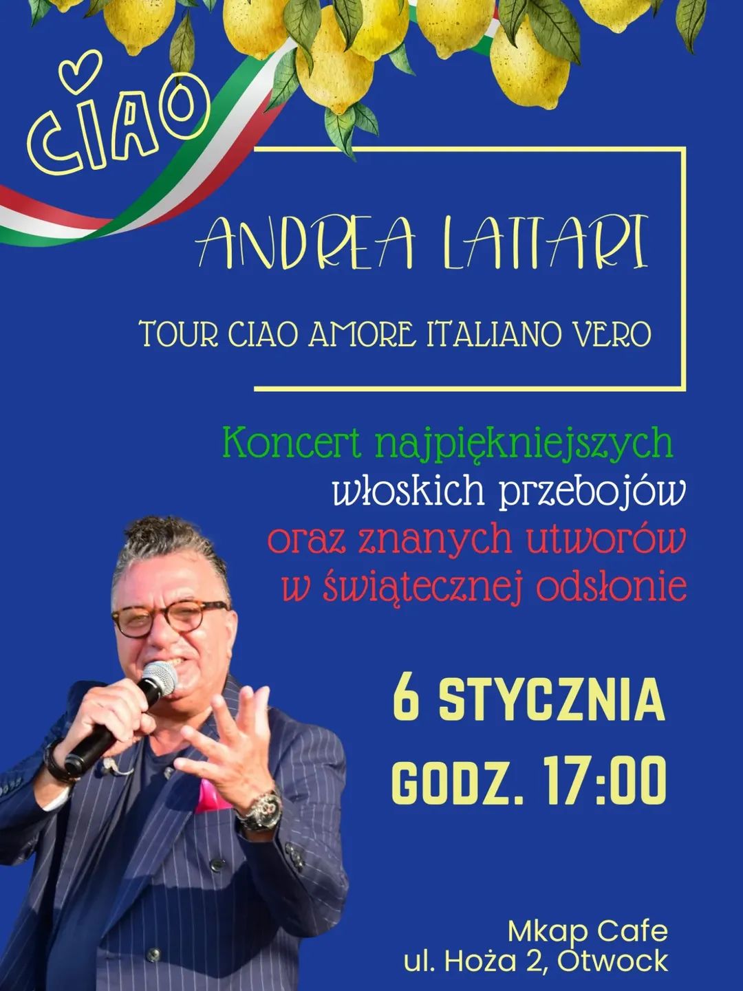 Zapraszamy na włoski koncert Andrea Lattari - "Ciao Amore Italiano Vero", który odbędzie się 6 stycznia o godz. 17:00 w MKAP Café w Otwocku.