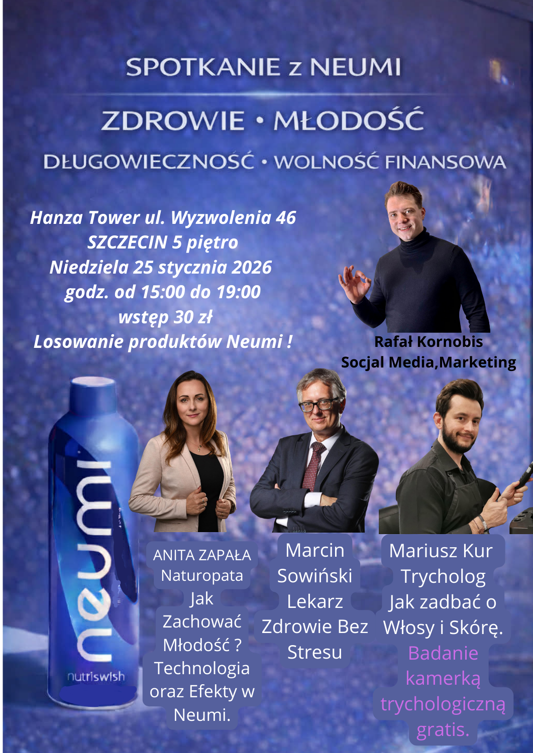 Zapraszamy sedrecznie na wyjątkowe spotkanie z Neumi w temacie Zdrowia, Młodości, Długowieczności oraz Wolności Finansowej! Nasi wspaniali prelegenci podzielą się swoją wiedzą i doświadczeniem. Poznacie świadectwa jak niezwyka Technologia Neumi HydraStat TM odmieniła życie tysiącom ludzi na całym świecie. Zgłębimy tajemince jak zachować zdrowie, młodość i dobrą jakość życia na długie lata. Przemawiać będą: