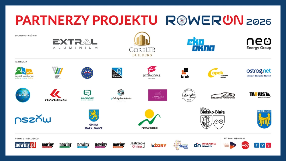 Zobacz również poniżej listę naszych sponsorów i partnerów edycji 2026, która ciągle rośnie i jest na bieżąco uzupełniania. Dziękujemy - z Wami RowerON jest największą imprezą rowerową w regionie! A jeśli masz firmę/instytucję i chcesz zostać sponsorem tegorocznej największej imprezy rowerowej w regionie zajrzyj tutaj i napisz do nas na maila [email protected]. Mamy super pakiety sponsorskie dla firm i instytucji!