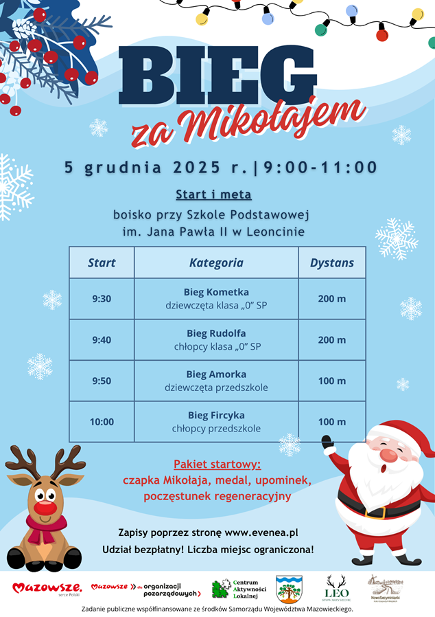 Na każdego uczestnika czeka pakiet startowy zawierający: czapkę Mikołaja, medal, upominek, poczęstunek regeneracyjny.