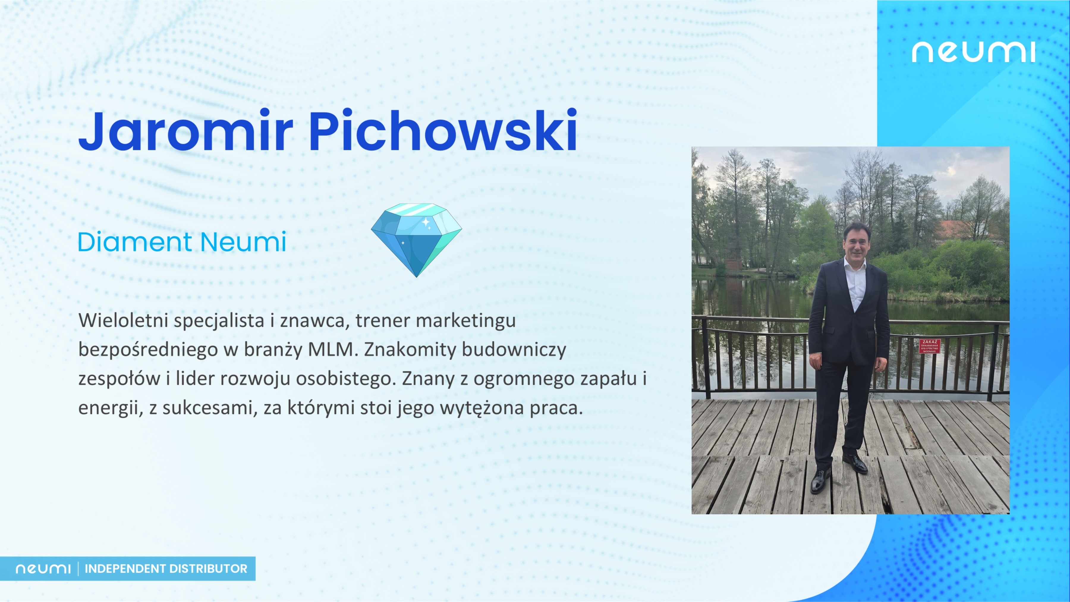 Ma 73 lata, a jego pierwszy kontakt z MLM był w 1973 Wcześniej - prywatny biznes, z wykształcenia ichtiolog. Urodzony Szczecinianin z pasją dla rozwoju ludzi w zespole, a zbudował w 2 lata w Neumi ogromy zespól w Polsce i nie tylko.