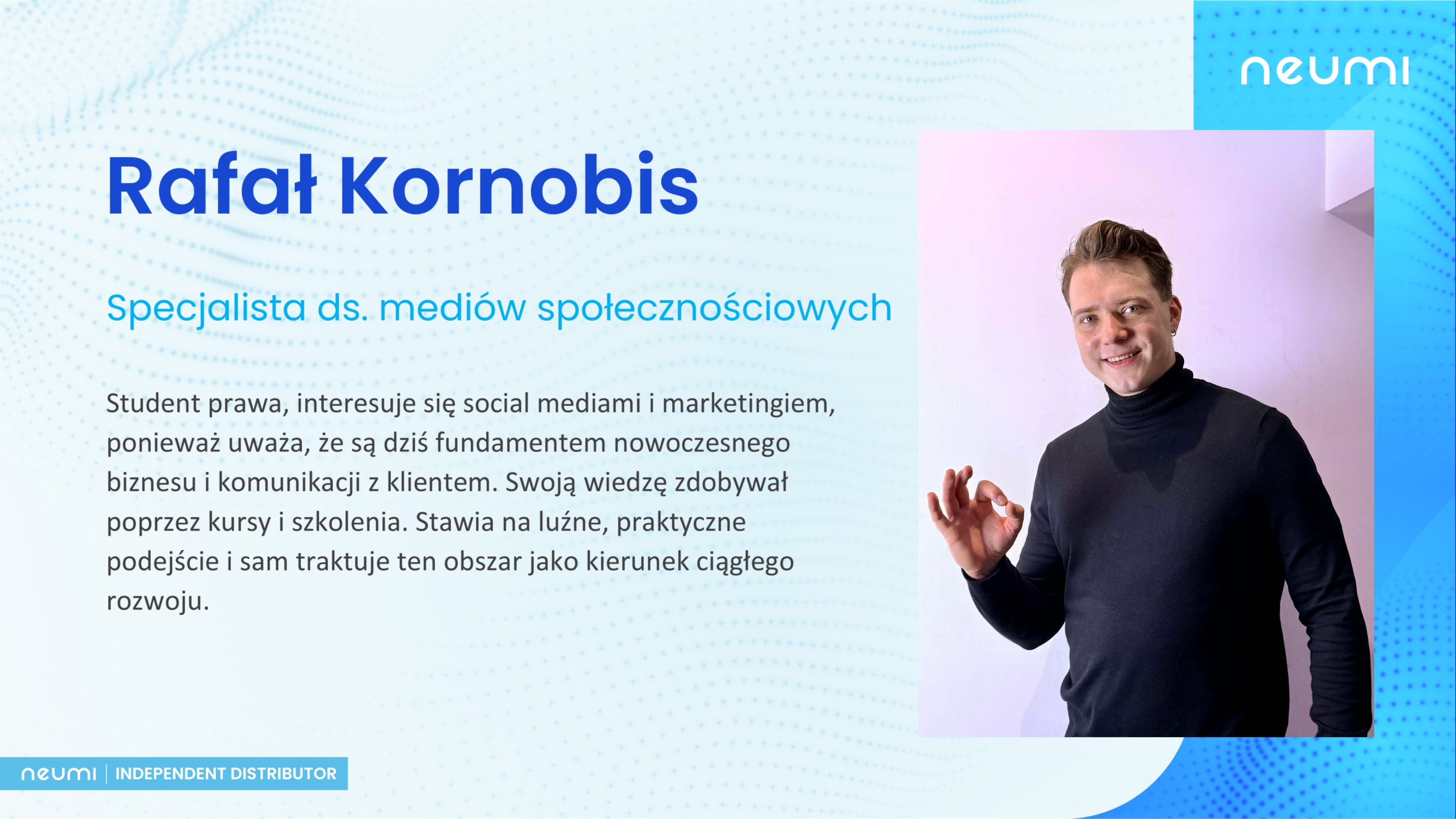 Rafał Kornobis student prawa, specjalista od Socjal Media Marketingu. W swoim wystąpieniu przedstawi podstawę wiedzy o mediach społecznościowych. Zapozna odbiorców z tajnikami marketingu online. Interesuje się social mediami i marketingiem, ponieważ uważa, że są dziś fundamentem nowoczesnego biznesu i komunikacji z klientem. Swoją wiedzę zdobywał poprzez kursy i szkolenia, a teraz ma przyjemność dzielić się uporządkowanymi podstawami z innymi. Z jego prezentacji uczestnicy zwykle wychodzą z konkretnymi zasadami dotyczącymi publikacji i prowadzenia działań w social mediach. Stawia na luźne, praktyczne podejście i sam traktuję ten obszar jako kierunek ciągłego rozwoju.