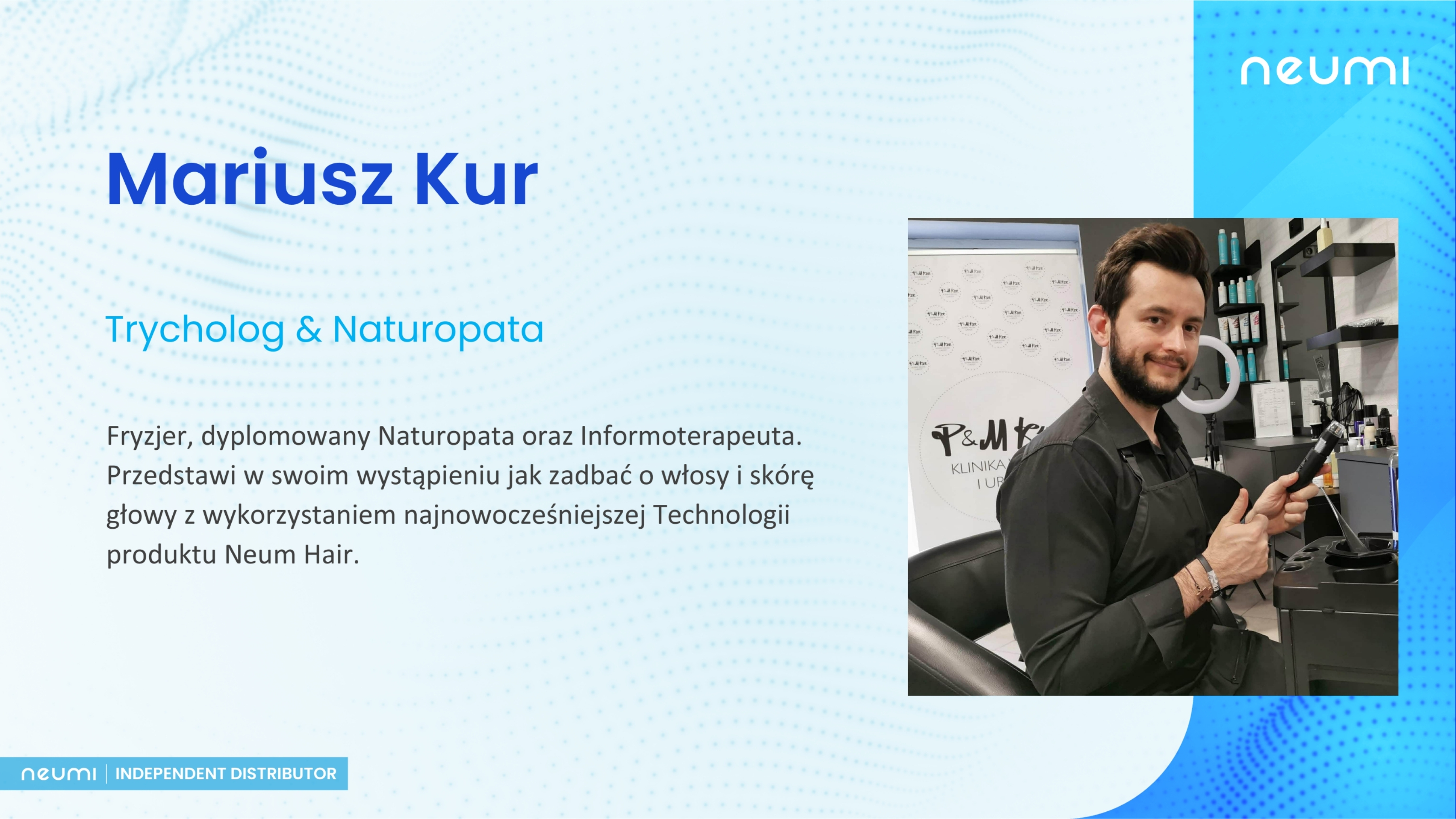 Wystąpi też Mariusz Kur, Trycholog, Fryzjer, dyplomowany Naturopata oraz Informoterapeuta. Przedstawi w swoim wystąpieniu jak zadbać o włosy i skórę głowy z wykorzystaniem najnowocześniejszej Technilogii produktu Neum Hair.