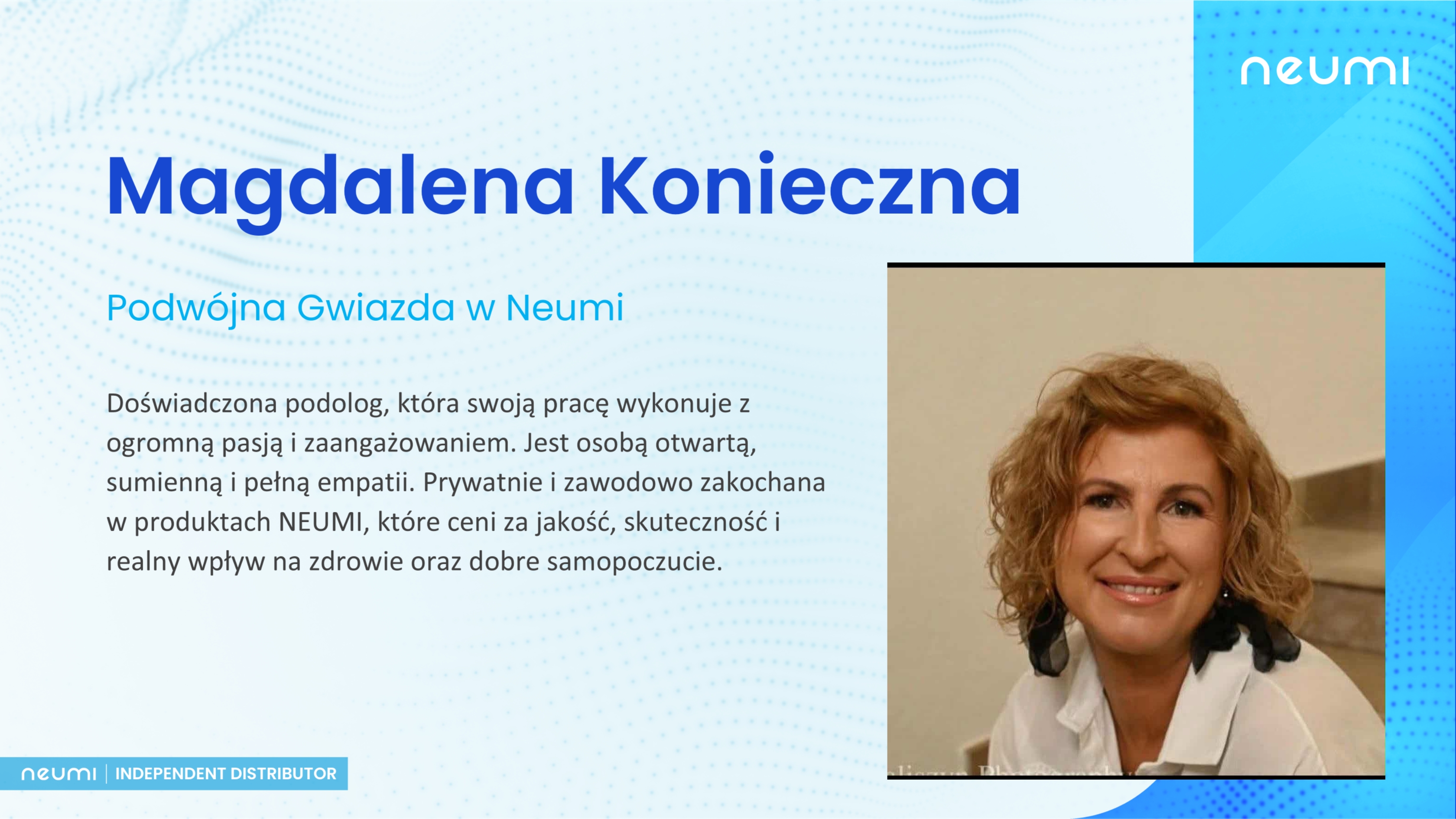 Wystąpi również Magdalena Konieczna. To doświadczona podolog, która swoją pracę wykonuje z ogromną pasją i zaangażowaniem. Jest osobą otwartą, sumienną i pełną empatii. Prywatnie i zawodowo zakochana w produktach NEUMI, które ceni za jakość, skuteczność i realny wpływ na zdrowie oraz dobre samopoczucie.