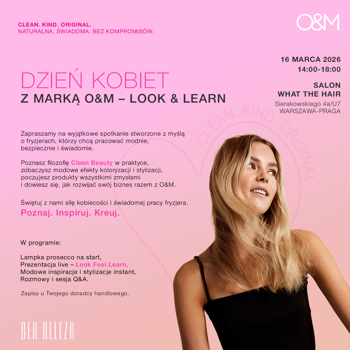 Poznasz filozofię Clean Beauty w praktyce, zobaczysz modowe efekty koloryzacji i stylizacji, poczujesz produkty wszystkimi zmysłami i dowiesz się, jak rozwijać swój biznes razem z O&M.