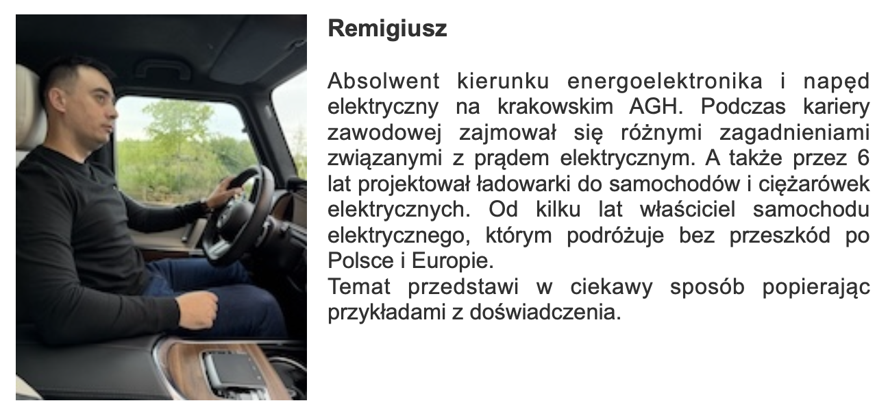 Dobry samochód elektryczny to wydatek 100 000 zł i więcej. Jeden błąd przy zakupie — zły model, nieodpowiednia infrastruktura — może kosztować dużo więcej niż cena tego kursu. Inwestujesz 249,69 zł żeby podjąć świadomą decyzję na lata. Z racji, że jest to pierwsze tego typu wydarzenie w Krakowie cena jest promocyjna.