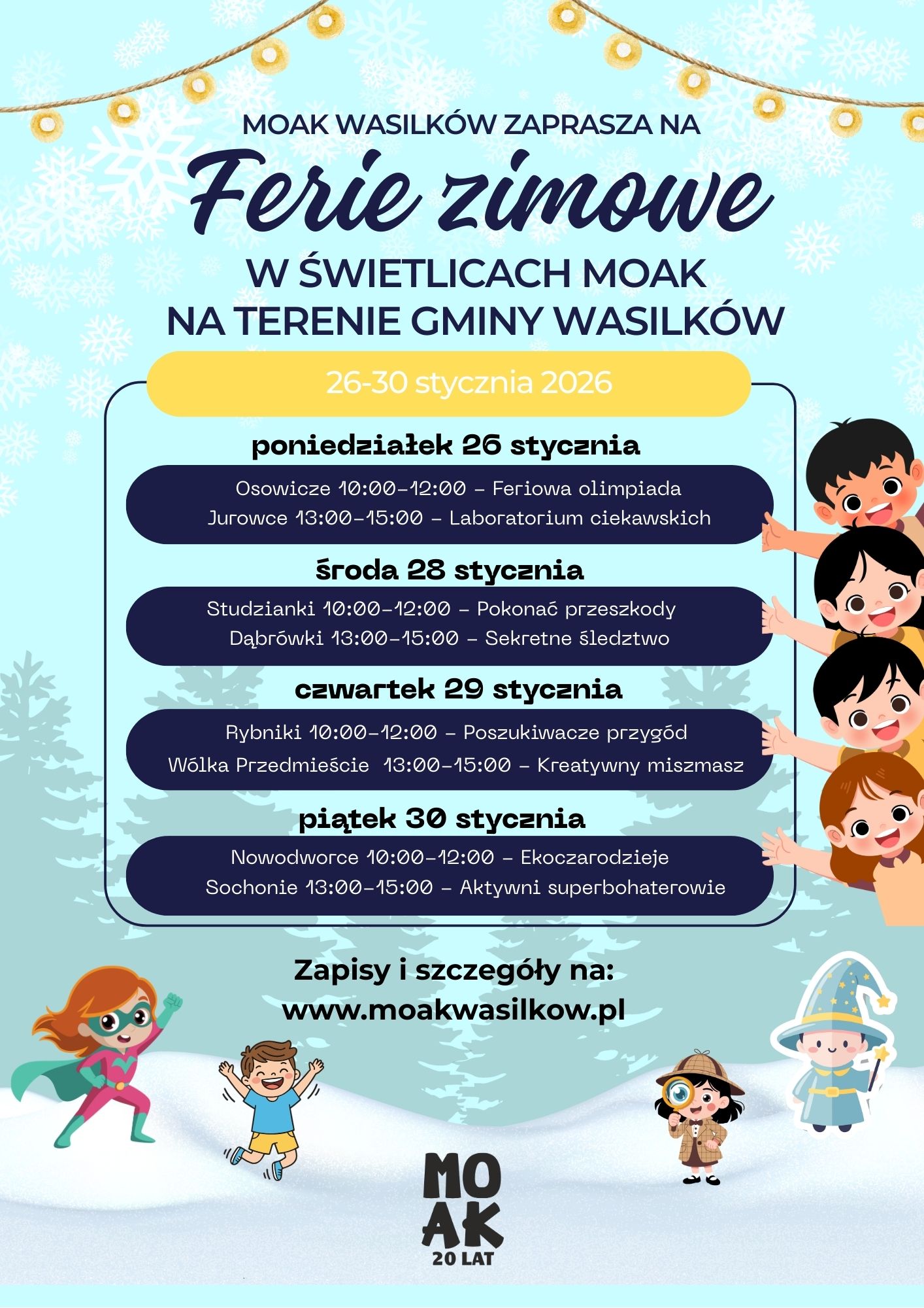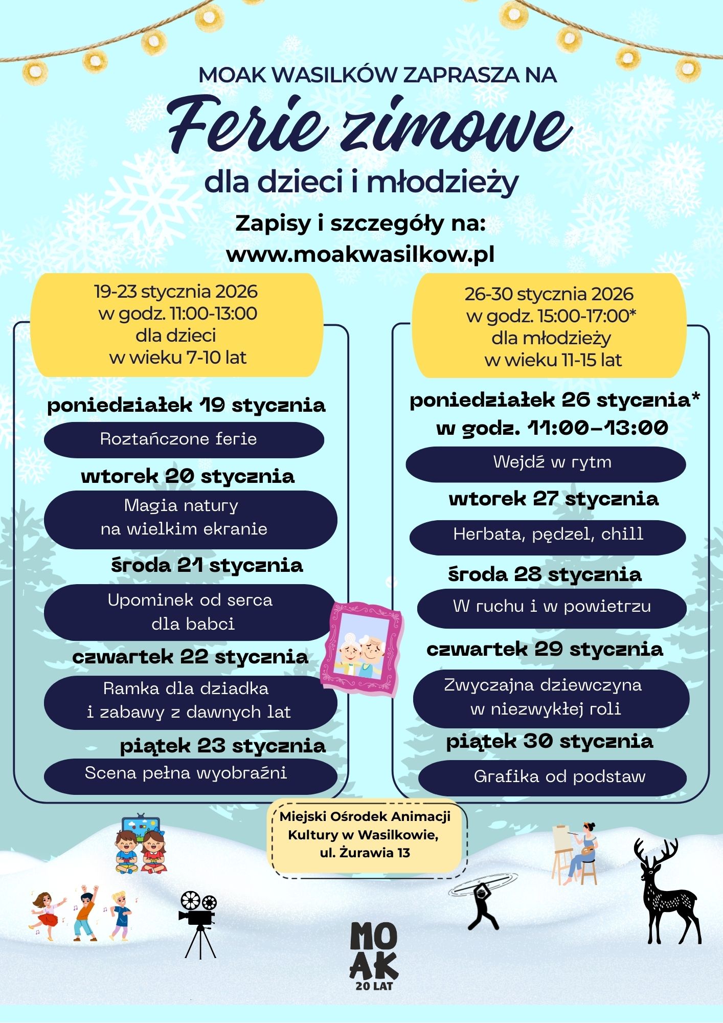 1. Ferie zimowe z MOAK dla dzieci w wieku 7-10 lat w siedzibie Miejskiego Ośrodka Animacji Kultury w Wasilkowie (ul. Żurawia 13) w terminie 19-23 stycznia w godzinach 11:00-13:00.