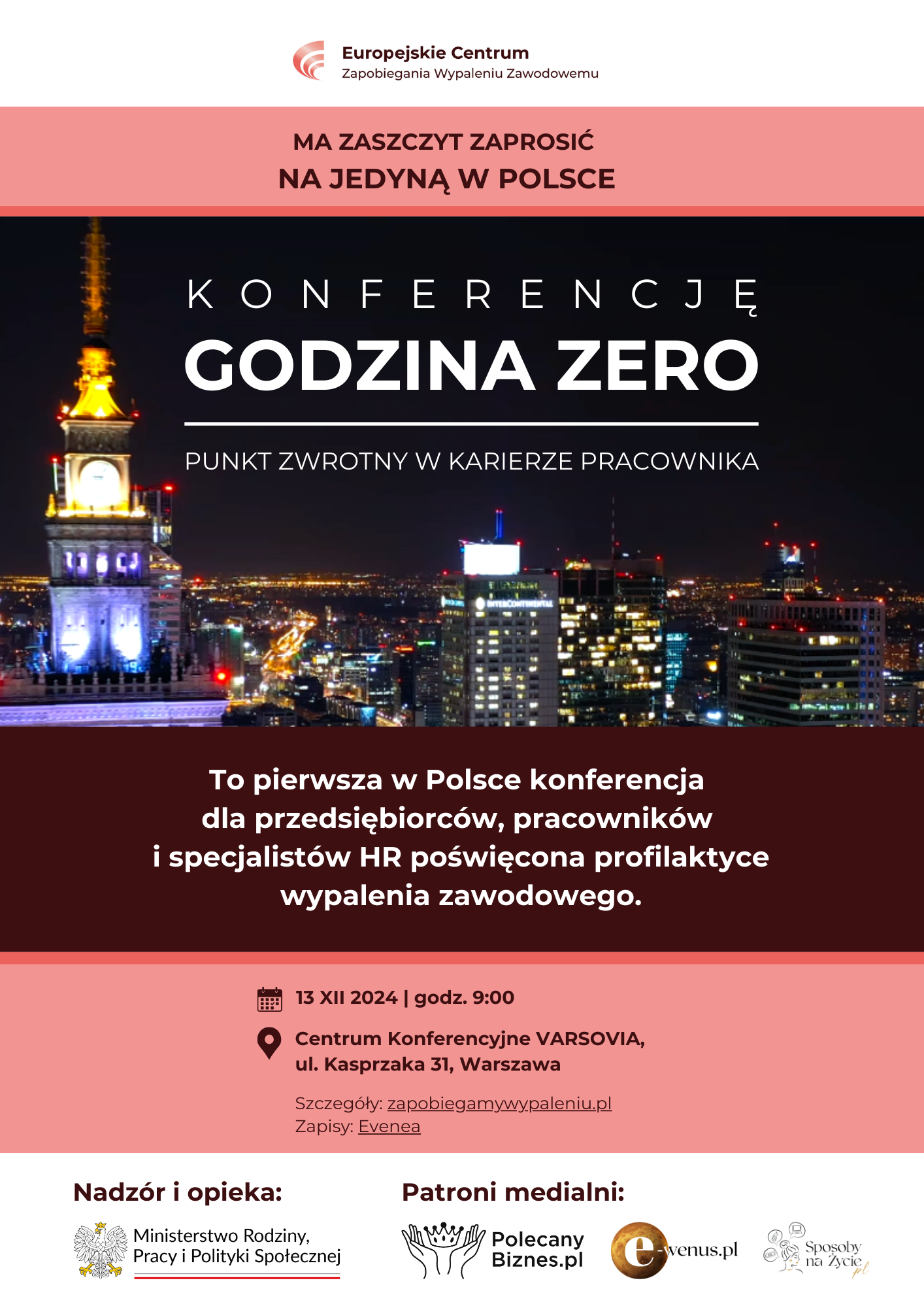 GODZINA ZERO to KONFERENCJA, która jest odpowiedzią na ważne i pilne potrzeby społeczeństwa i szeroko rozumianego biznesu. Wypalenie zawodowe to stan emocjonalny, kondycja psychosomatyczna, która znacząco wpływa na ścieżki kariery pracowników, społeczne życie jednostki oraz zasoby ekonomiczne i personalne przedsiębiorstwa.