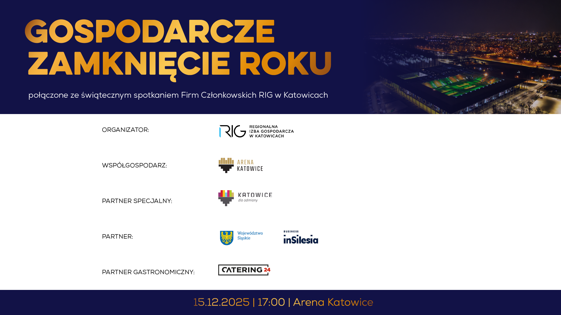 Regionalna Izba Gospodarcza w Katowicach zaprasza na ostatnie wydarzenie w tym roku - Gospodarcze Zamknięcie Roku, połączone ze świątecznym spotkaniem Firm Członkowskich RIG w Katowicach, które odbędzie się 15 grudnia w wyjątkowych przestrzeniach konferencyjnych Areny Katowice.