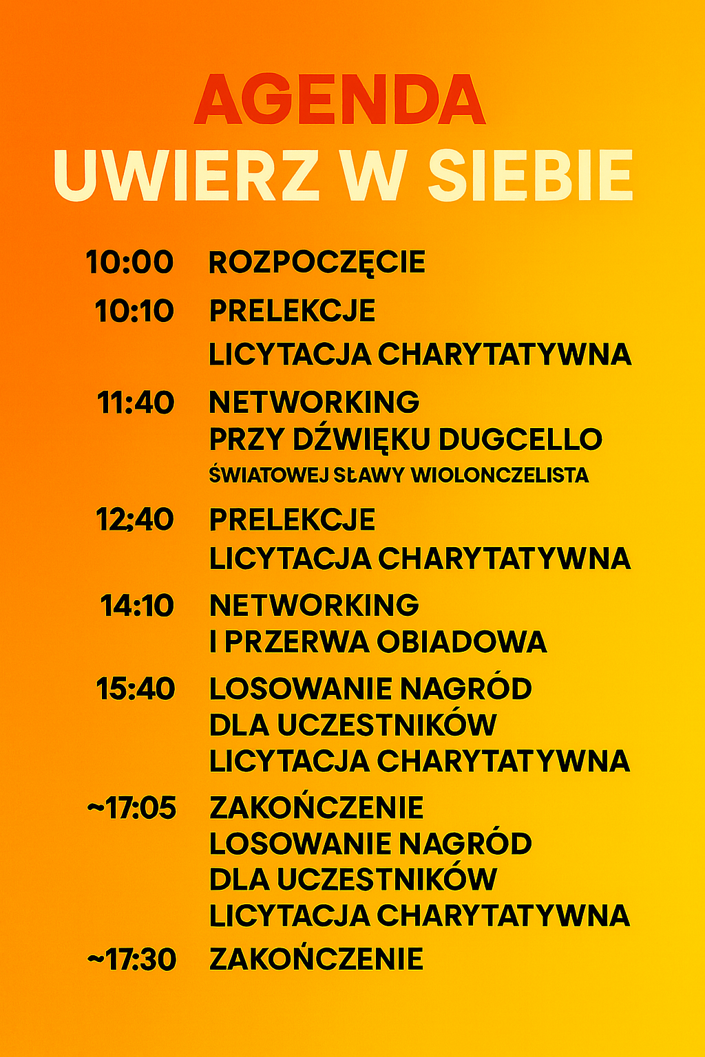 Przygotuj się na dzień pełen inspiracji, wyjątkowych ludzi i poruszających historii, które rozbudzą w Tobie moc do zmiany i działania. To właśnie tutaj znajdziesz energię, wsparcie i motywację, których potrzebujesz, by zacząć nowy rozdział w swoim życiu. Nie przegap tej szansy na transformację - pozwól sobie uwierzyć, że wszystko jest możliwe!