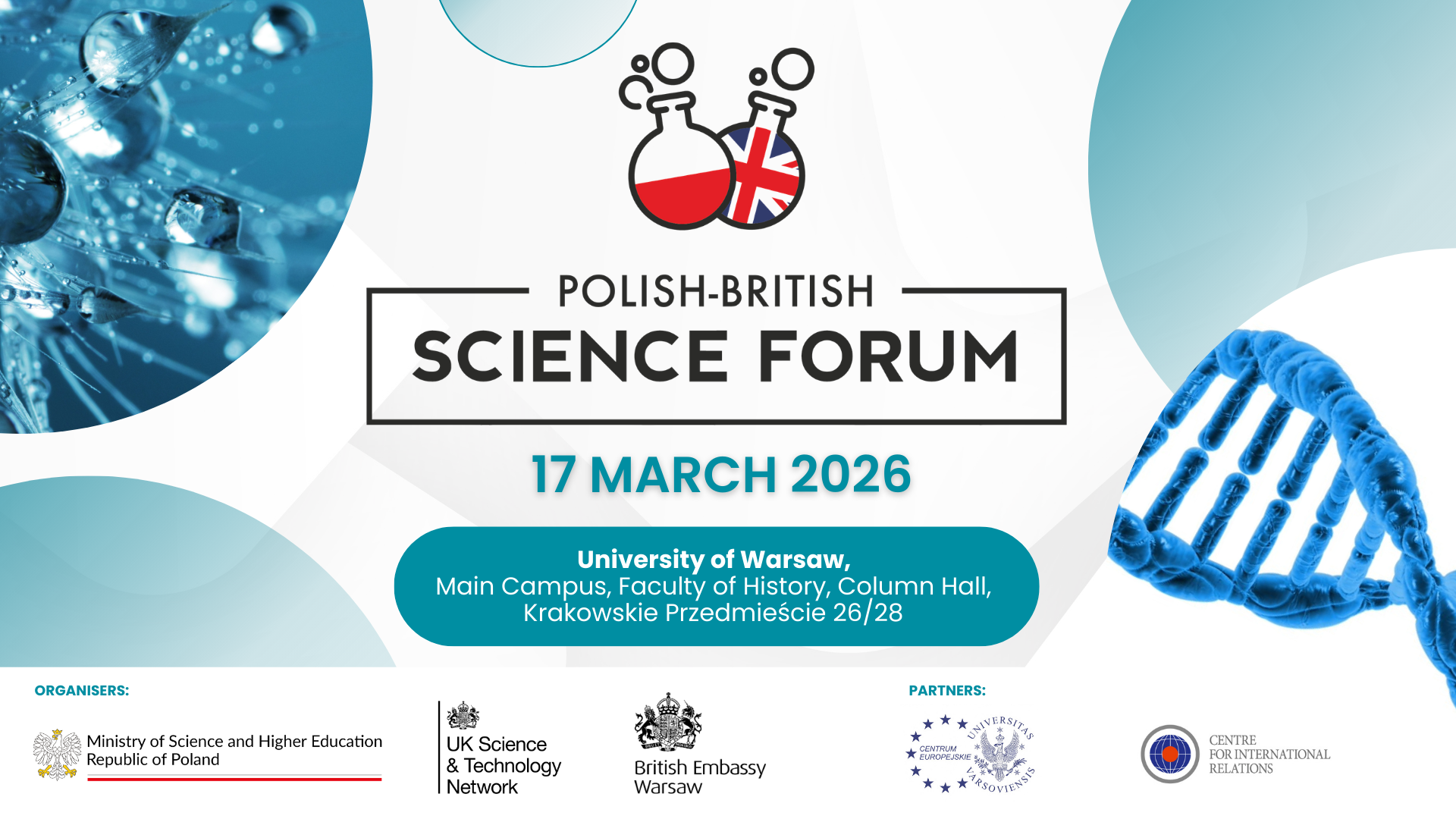 We are pleased to invite you to take part in the Polish-British Science Forum, which will be held on 17 March 2026, from 9:00 a.m. to 3:15 p.m., in the Column Hall (Faculty of History) at the Main Campus of the University of Warsaw (Krakowskie Przedmieście 26/28, Faculty of History, Column Hall).