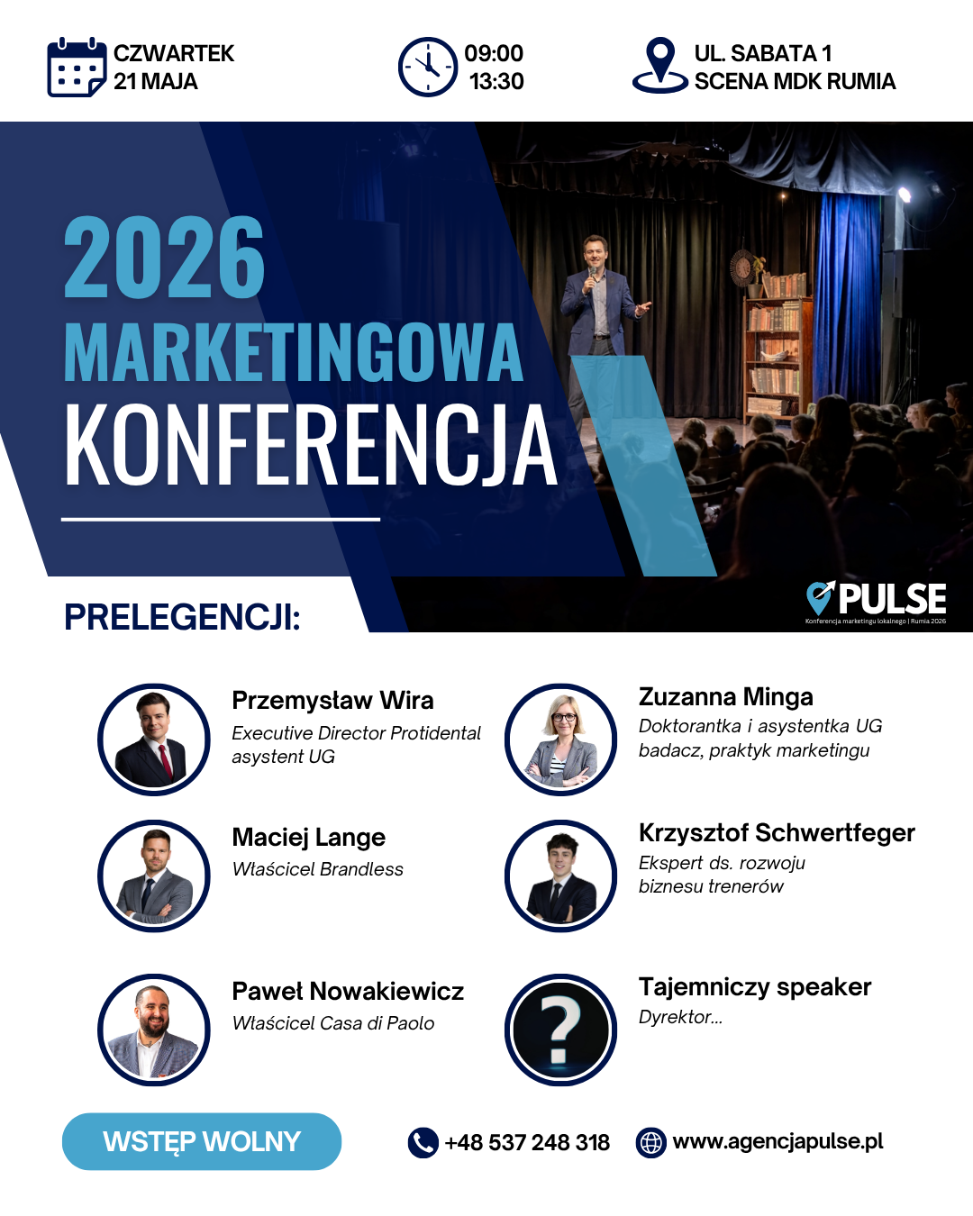 PULSE to konferencja skierowana do właścicieli i osób zarządzających małymi i średnimi firmami, którzy chcą rozwijać swój marketing w sposób praktyczny i dopasowany do realiów lokalnego rynku. W trakcie wydarzenia skupimy się na konkretnych rozwiązaniach, które można wdrożyć od razu - bez zbędnej teorii. To przestrzeń do zdobycia wiedzy, wymiany doświadczeń oraz nawiązania wartościowych kontaktów biznesowych.