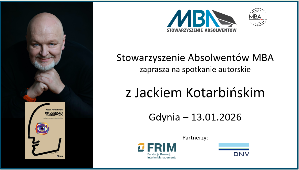 Zarząd Stowarzyszenia Absolwentów MBA zaprasza na spotkanie autorskie z Jackiem Kotarbińskim i jego nową książką "Influencer Marketing". Partnerem spotkania jest Fundacja Rozwoju Interim Managementu oraz DNV.