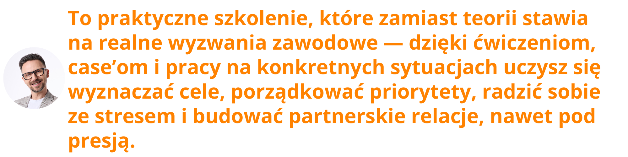 ● Zyskasz praktyczne techniki radzenia sobie ze stresem i emocjami, co pozwoli Ci działać skutecznie nawet w trudnych sytuacjach.