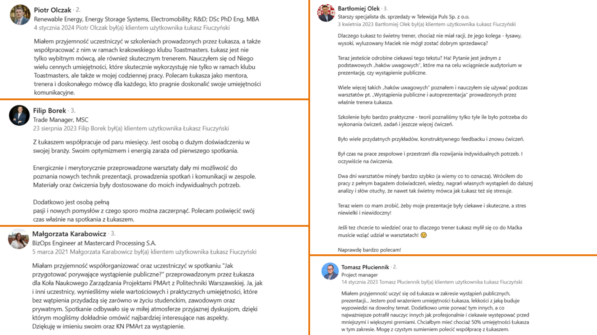 - Pracujesz z praktykiem, nie teoretykiem - Twoim trenerem b臋dzie wicemistrz Polski w wyst膮pieniach publicznych Toastmasters International, m贸wca TEDx i do艣wiadczony ekspert, kt贸ry od lat szkoli mened偶er贸w i przedsi臋biorc贸w.