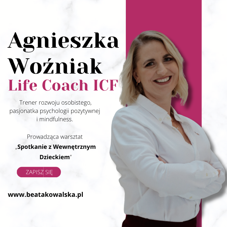 Agnieszka Woźniak to certyfikowany Life Coach ICF, trener rozwoju osobistego i pasjonatka psychologii pozytywnej. Wierzy, że przyszliśmy na świat, by doświadczać pełni życia - radości, marzeń, ale też trudniejszych emocji, które uczą nas, jak odnaleźć szczęście