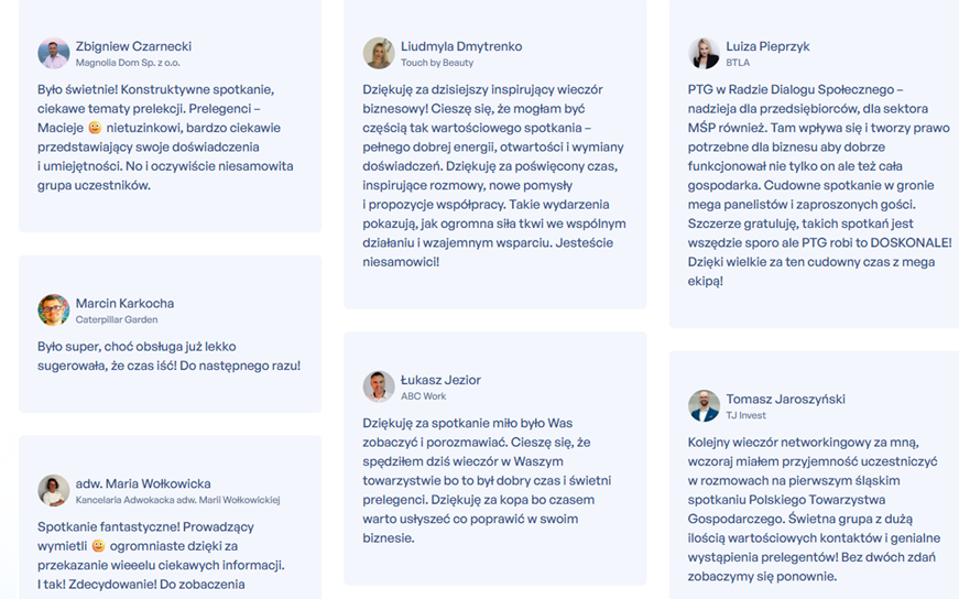 Networking, o skuteczności którego przekonało się już wielu członków naszej organizacji. Spotkasz przedsiębiorców z wielu branż, do których na co dzień trudno jest dotrzeć. To Twoja szansa na pozyskanie nowych klientów, partnerów i dostawców. W końcu biznes to relacje! Te prawdziwe, wartościowe, inspirujące, oparte na wzajemnym zaufaniu, nie na nachalnych próbach sprzedaży swoich produktów czy usług. Jeśli chcesz nawiązać znajomości, wymienić się wiedzą i doświadczeniem, a to wszystko bez obaw o kłopoty z asertywnością - nasze wydarzenie jest właśnie dla Ciebie!