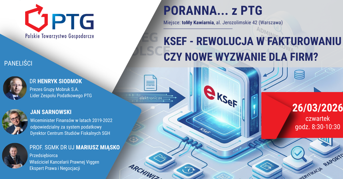 Zapraszamy na poranną debatę Polskiego Towarzystwa Gospodarczego poświęconą wdrożeniu Krajowego Systemu e-Faktur (KSeF) - jednej z największych zmian w polskim systemie podatkowym ostatnich lat.