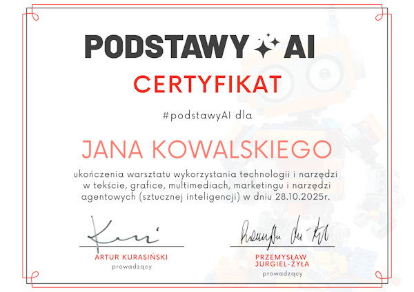 Każda osoba po warsztatach będzie bardzo dobrze rozumieć co i jak działa w szeroko pojętym obszarze sztucznej inteligencji. Naturalnie będzie się poruszać po narzędziach, płynnie tworzyć zapytania i prompty realizujące oczekiwany efekt. Skutecznie pracować z AI minimalizując obszar halucynacji wynikających ze sposobu działania modeli językowych. Oprócz przekrojowego zapoznania się z wszystkimi poruszanymi zagadnieniami z warsztatu, osoba po zajęciach z nami będzie potrafiła dobierać najlepsze narzędzia i oprogramowanie dla potrzeb swoich, swojego zespołu i firmy. Dodatkowo każdy uczestnik/uczestniczka otrzyma od nas certyfikat ukończenia warsztatu: